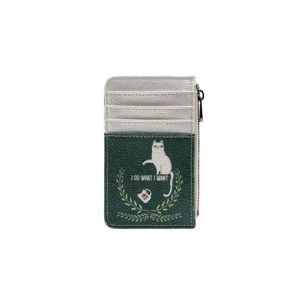 Cardie C cüzdan ile aksesuarlarınıza eğlenceli bir dokunuş katın.; Kadınlar için tasarlanan bu çok renkli kartlık, kahveyi döken sevimli bir kediyi gösteren "I Do What I Want" tasarımıyla dikkat çekiyor.; Vegan malzemelerden üretilen bu sevimli aksesuar, hem çekiciliği hem de işlevselliği mükemmel bir şekilde dengeliyor.